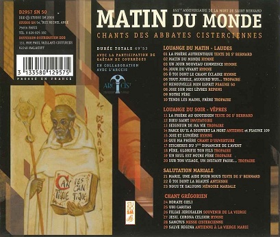 Réalisé à l'occasion du 850ème anniversaire de la mort de Saint Bernard, ce CD vous comporte des chants de différentes abbayes cisterciennes de France et de Suisse francophone, ainsi que quelques textes du"Docteur melliflue" qui vous donneront un aperçu de notre patrimoine liturgique :