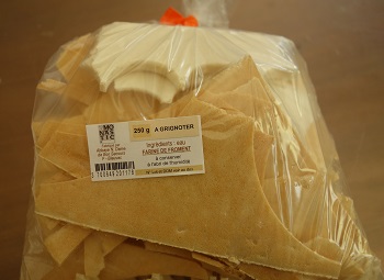 Quand nous découpons les hosties (rondes) dans les plaques rectangulaire, nous produisons des morceaux de plaques, que les petits, et aussi les grands' aiment parfois grignoter. Nous les conditionnons alors en sachets de 250 g, en panachant morceaux dorés et blancs.