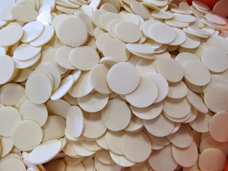 Nos hosties sont fabriquées avec de la farine de froment et de l'eau (sans d'addition d'huile). Elles sont coupées à un diamètre de 32 mm, qui est le diamètre standard des monastères producteurs. Au séchage, elles connaissent un léger rétreint, variable suivant les conditions météorologiques.